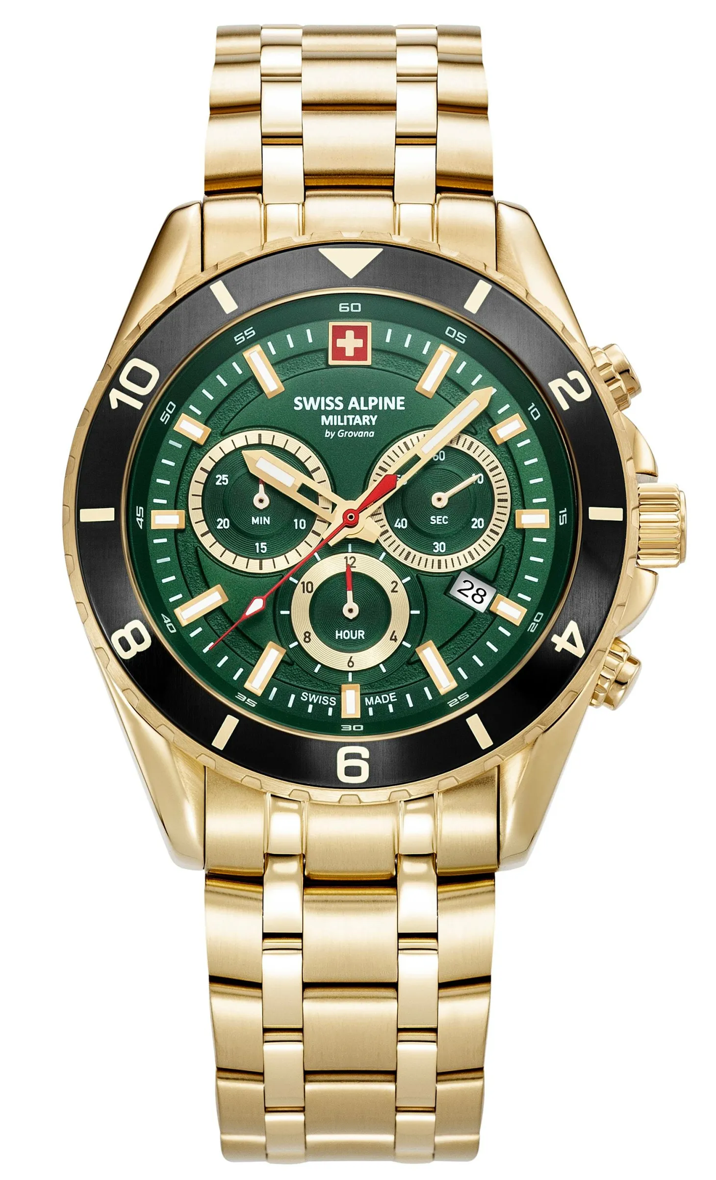Produktinformationen „Swiss Alpine Military 7034.9118 Sierra Chrono Herrenuhr – Edelstahlgehäuse in Gold mit grünem Ziffernblatt 7034.9118“