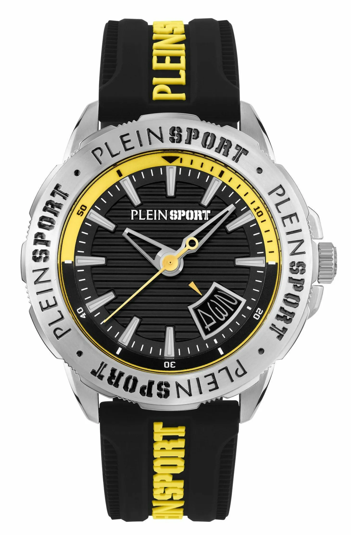 Produktinformationen „Plein Sport Herren Uhr mit umtauschbaren Armband RAMPAGE PSGDA0524 Silber‑Grau Edelstahl Schwarz/Gelb 44 mm“